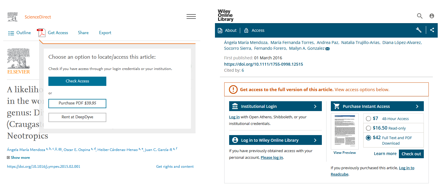 Para el acceso a la bibliografía como investigador independiente, algunas revistas no cobran a los lectores por el acceso a sus artículos, pero las revistas de grandes editoriales pueden llegar a solicitar un pago por el acceso a un único artículo incluso sólo de manera temporal. Mientras tanto, las instituciones pagan para que sus estudiantes e investigadores puedan acceder desde sus redes a los artículos depositados en grandes bases de datos. Web of Science y Scopus son algunas de las bases de datos de revistas científicas más difundidas sobre diferentes campos científicos que se utilizan con frecuencia para la búsqueda bibliográfica. Los precios para acceder a estas bases de datos varían en función del tamaño de las instituciones y pueden ser de 20.000 a 120.000 dólares anuales.
